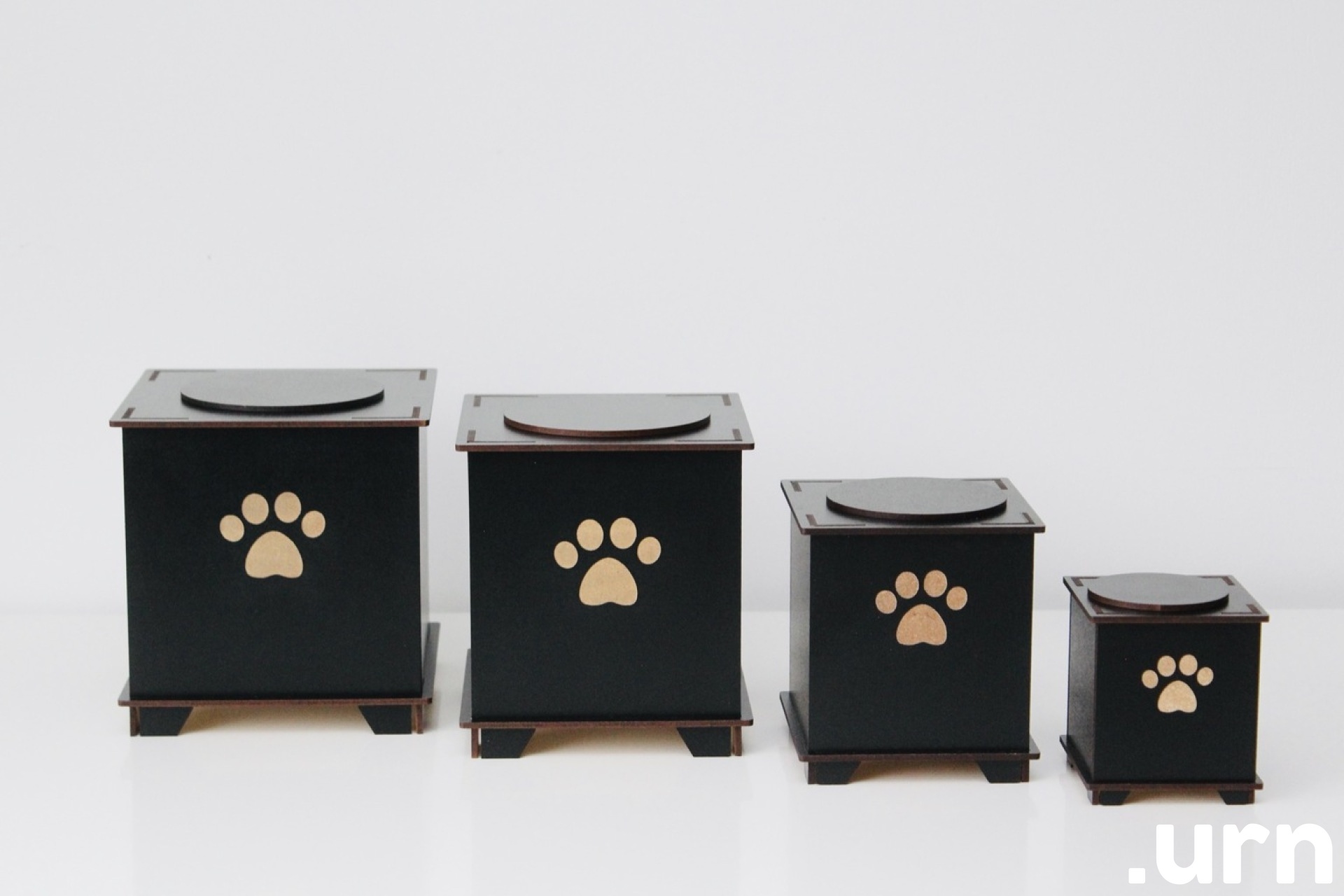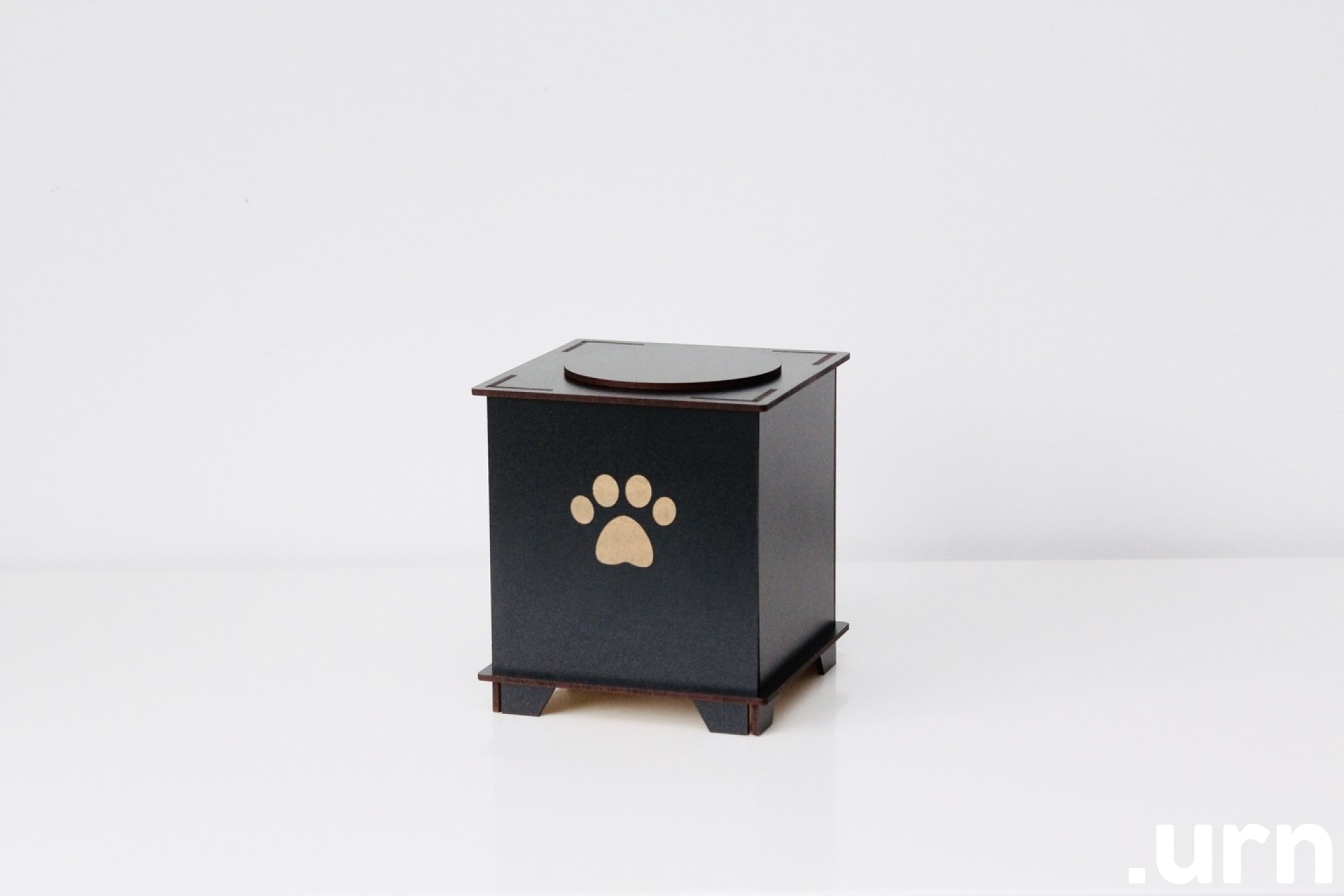 Musta värvi neljakandiline lemmiklooma tuhastusurn, mille esiküljel on armas käpajälje sümbol. Urn on valmistatud naturaalsest pressitud puidust ning see ei sisalda ühtegi metallist ega muid kahjulike elemente loodusele. Urni avamise ja sulgemise teeb hõlpsaks pöörates avatav kaas.