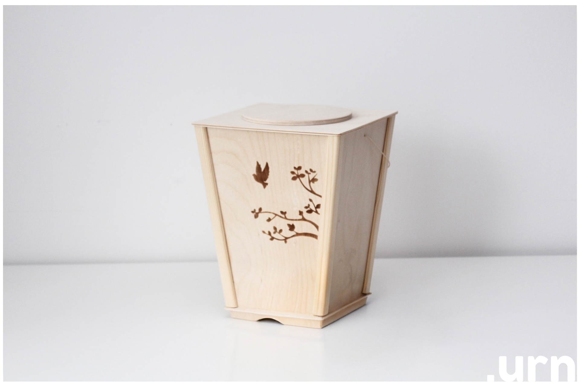 Naturaalsest kasevineerist ja puuvillase vahatatud nööriga ökoloogiline urn. Urni avamise ja sulgemise teeb hõlpsaks pöörates avatav kaas.