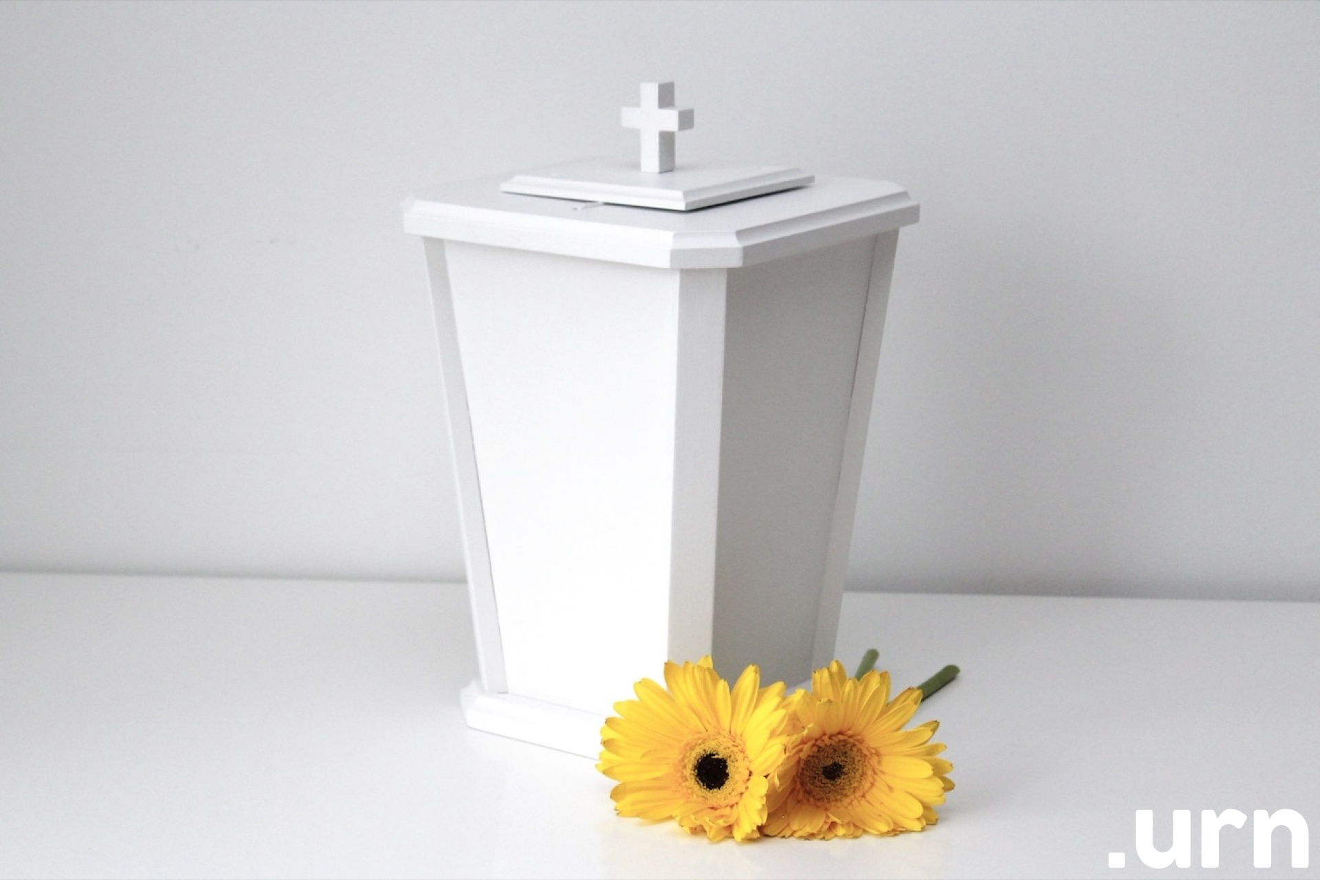 Tradistioonilise disainiga valge männipuust urn. Urnile on kinnitatud haudalaskmise nöör.