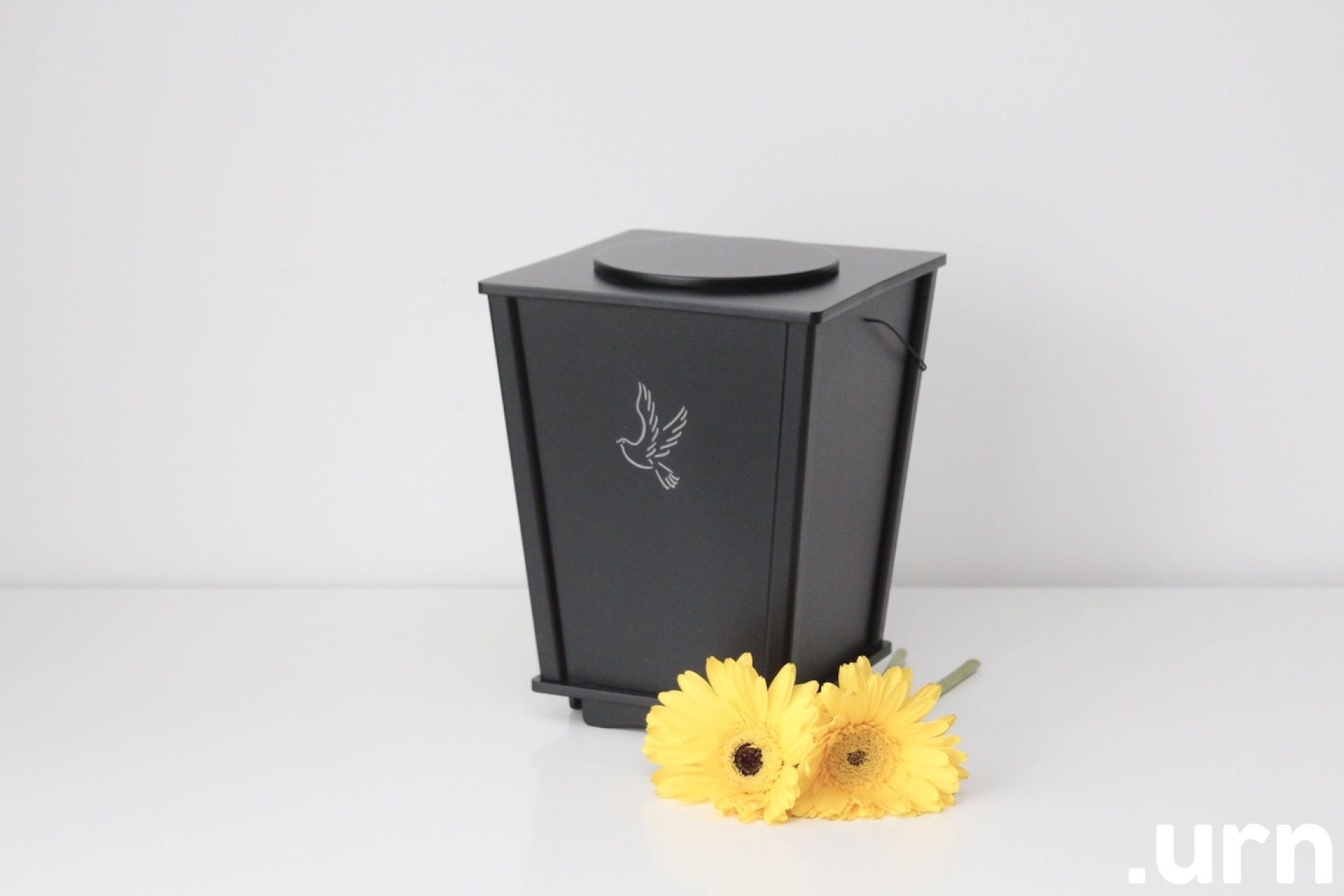 Kuldse linnu motiiviga soliidne musta värvi klassikalise disainiga neljakandiline vaasikujuline urn. Valmistatud naturaalsest pressitud puidust. Urni avamise ja sulgemise teeb hõlpsaks pöörates avatav kaas. Lisaks on urnile kinnitatud hauda laskmiseks mõeldud nöör.