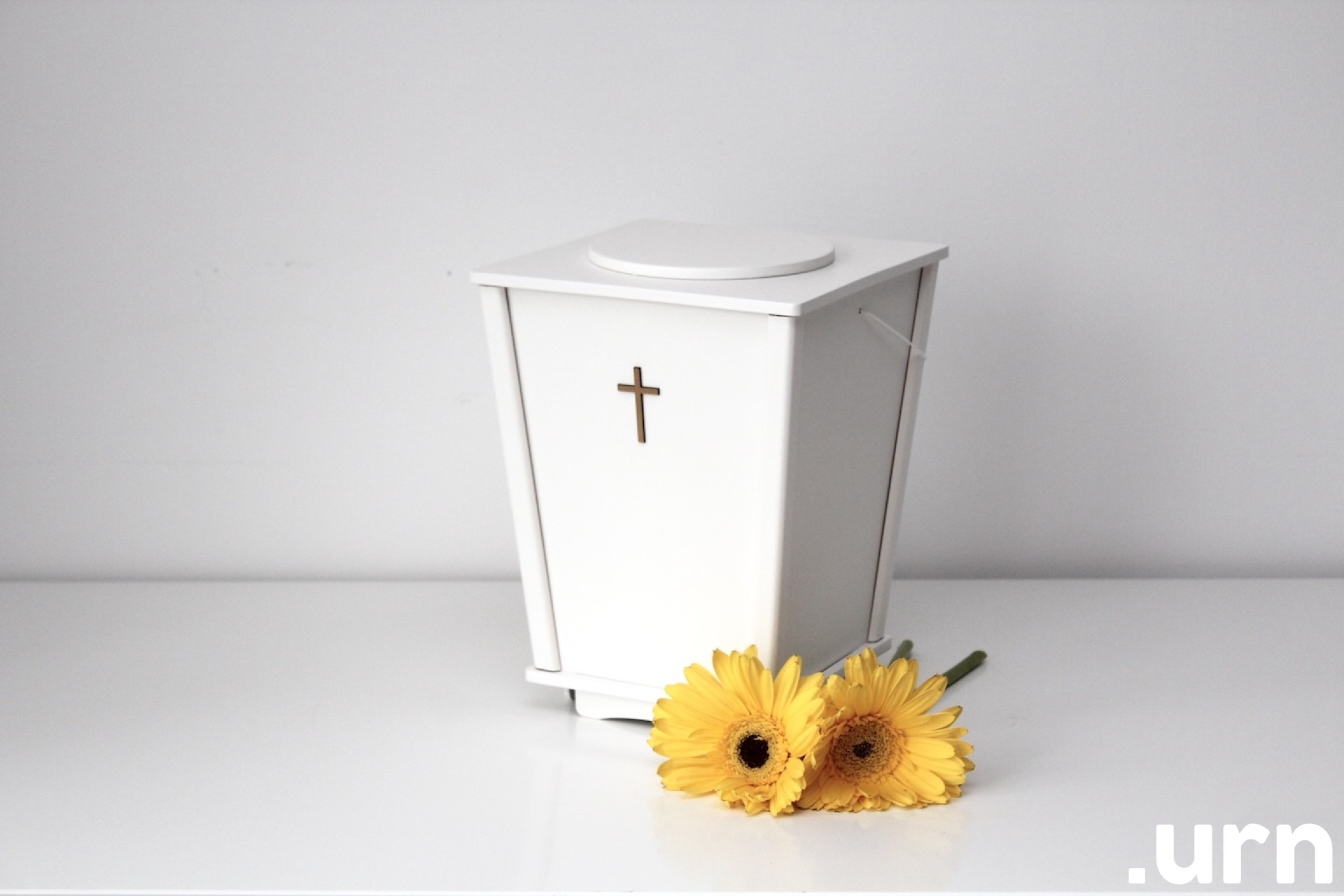 Kuldse risti motiiviga soliidne valget värvi klassikalise disainiga neljakandiline vaasikujuline urn. Valmistatud naturaalsest pressitud puidust. Urni avamise ja sulgemise teeb hõlpsaks pöörates avatav kaas. Lisaks on urnile kinnitatud hauda laskmiseks mõeldud nöör.